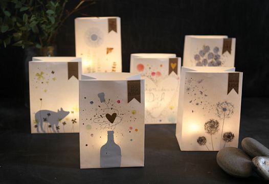 Farbenfrohe Motive auf der Außenseite ergänzen sich beim Erleuchten der Tüte, durch ein auf der Innenseite gedrucktes Motiv.